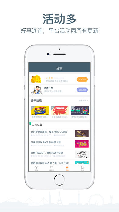闪贷借款是一款贷款搜索信息服务平台,致力于为用户提供金融贷款产品搜索,推荐服务。 【活动优惠】 减息活动优惠多,为借款人第一时间推荐各放款机构的优惠活动。 【精准推荐】 根据客户提交的信息,精准推荐借款平台,省心又省力。 【海量机构】 精选众多知名放款机构,总有一个适合您的。 【搜索比价】 专业的贷款搜索比较服务,帮助借款人,足不出户,最低成本的选择合适自己的借款平台。 欢迎加入QQ群:361474300