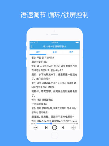 首尔大学韩国语是为在首尔大学语学研究所学习现行韩国语教育课程的不同地区的成人学习者编写的。 现行的首尔大学对外国人的韩国语教育分为4个学期(每学期10周),共计800课时。学习者在结束全部课程后,在听、说、读、写四个方面全面掌握在韩国升学、就业等多种社会生活中所需的基本韩国语口语能力。 首尔韩国语1从易到难地介绍韩国语语法体系和句子结构,选取日常生活中使用韩国语的实际情景编排课文内容,在轻松不枯燥的学习过程中培养零起点学习者日常生活中必备的基础韩语入门沟通能力和韩语口语能力。 【功能特色】 -兼容iPhone/iPad,无广告,无需联网; -支持锁屏控制、后台播放; -支持播放记忆、支持语速调节; -支持循环/单课播放; -内容全面,包含课文、单词、韩语语法知识。