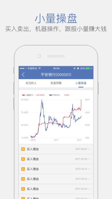 【股小量-人人都需要的炒股机器人】 荐股、诊股、解套,小白股民必问的炒股三神问,小量有问必答! 基本面、技术面、政策面,老股民最关心的股市情报,小量零延迟提供,面面俱到! 作为一个智能炒股机器人,股小量有冷静理性的投资策略和拟人化的思维、对话、记忆 和情感,来满足每一位投资者的个性化需求。 小量的心愿是:股市大涨!!! 股小量特色: 【智能机器人】 7*24小时为股民提供个股资讯,个股诊断,个股对比,解套方案等。 【预警】 通过对行情、舆情、业绩等多样化大数据的量化分析,对用户持仓股票进行向上向下变 盘预警通知,成功逃顶率90%以上。 【逃顶】 2015年12月21日,沪指3642,股小量连续发出大盘向下变盘预警,预测股市将在2670区域 筑底,1月27日沪指下行至2638区域; 2016年4月18日,沪指3033,股小量发出大盘向下变盘预警,5月12日沪指下行至2780区域 。 【抄底】 2016年1月28日,沪指2655,股小量发出大盘向上变盘预警,2月24日沪指上行至2928区域 ; 2016年3月1日,沪指2733,股小量发出大盘向上变盘预警,4月14日沪指上行至3082区域。 【实盘】 开创国内自有资金投资策略的先河,真正做到与用户共进退。