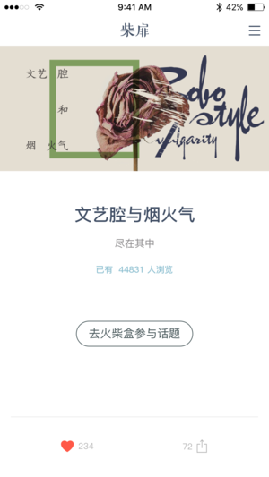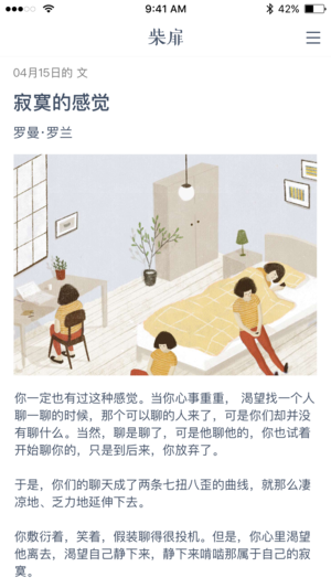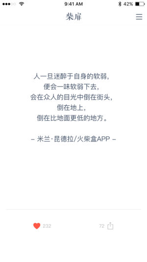 柴扉是一个分享打动人心事物的 App。 柴扉每天都会推荐一首歌、一则语录、一篇文章,每天用十分钟的细碎时光,点燃内心的光明。 柴扉,火柴盒出品。 柴扉会员说明 1、购买一次周期:31天; 2、每次购买价格:12元; 3、付款:用户确认购买并付款后记入您的iTunes账户; 4、隐私政策:http://chaifei.huochaihe.cc/agreement/privacy.html 5、柴扉会员服务协议 :http://chaifei.huochaihe.cc/agreement/member.html
