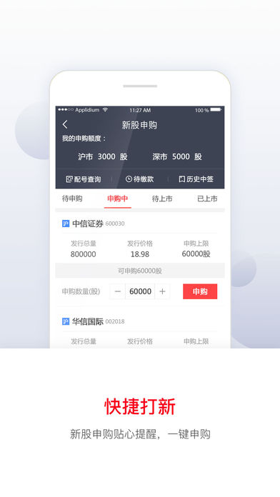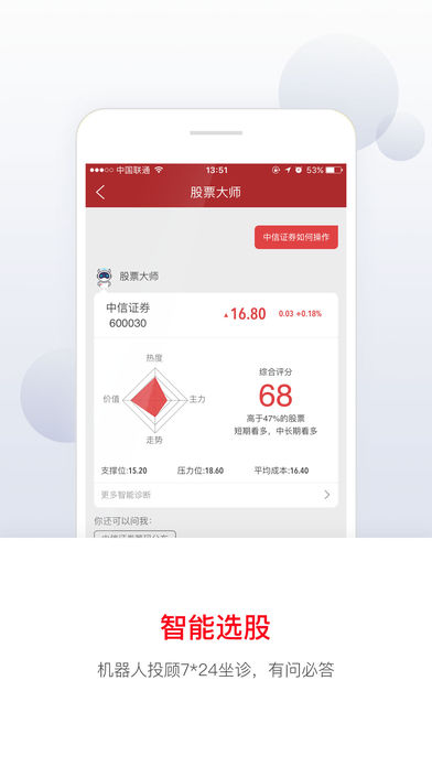 信e投是中信证券为投资者定制的投资神器。通过对金融科技的专注以及用户体验的追求,坚持以投资者利益为中心的理念,全方位实现各种证券业务,力争成为更多投资者信赖的券商App。 [详细功能] • 首页:八大常用功能入口,更简单,更懂你; 股票入口包括:自选股、委托交易、新股申购和智能投顾股票大师,支持手机自助开户; 理财入口包括:金融超市、银证转账; 新增资讯入口,获取财经资讯更轻松; • 行情:提供沪深港美行情,一手掌握全球市场; • 交易:同步普通账户和信用账户,一键切换更轻松; • 理财:提供基金、现金管理、资管、私募等品类丰富的理财产品; • 我:开户7*24小时,在线办理更多证券业务; • “信”服务:创新智能机器人投顾,大数据解析资金流向。 [联系我们] 如果您在股票投资、App使用上有任何疑问,欢迎通过以下方式联系: 1、点击App左上角“信”,咨询“股票大师”; 2、点击App“设置”,选择“用户反馈”; 3、致电24小时客服电话95548。