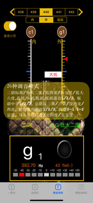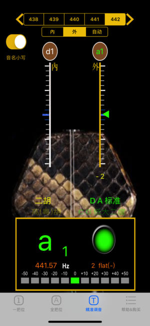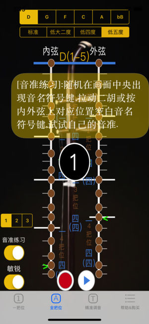 [二胡音准-不止是调音器] 简洁的使用介面, 2弦图示音准位置, 噪音过滤, 音准显示稳定, 无需任何设定, 打开APP, 拉动二胡, 自动将音准显示于画面弦上的相对应位置, 供练琴者比对自己左手按弦位置是否正确, 可以有效提升音准, 特别是音感不佳及不熟习把位的学琴者. 彻底解决, 左手按弦换把位时, 身旁没老师纠正音准的痛苦. 功能说明: [1把位分页] ▪ 空弦调音[免费] : 空弦时, 拉动二胡任一弦, 绿色三角箭头若对准空弦上蓝线位置, 即为音准, 准确度在正负25分位(cents)内. 超出范围时, 绿色三角箭头会变成红色. ▪ 即时音准反馈[免费] : 演…