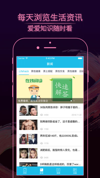 【产品简介】 介绍两性健康的相关知识和内容。通过算法猜出您的兴趣,向您推荐最适合您的两性健康知识,同时您也可以向医生进行咨询。 【产品特点】 特点一:海量信息知识,有量且有质量,更新迅速来源站权威 特点二:最先进算法,完全个性化订阅,颠覆你的阅读体验,只看想看的内容 特点三:界面清爽简洁,不同人群应用更贴心 【联系合作】 医疗机构合作 Tel:010-57232324 邮箱:hkw@doumob.com