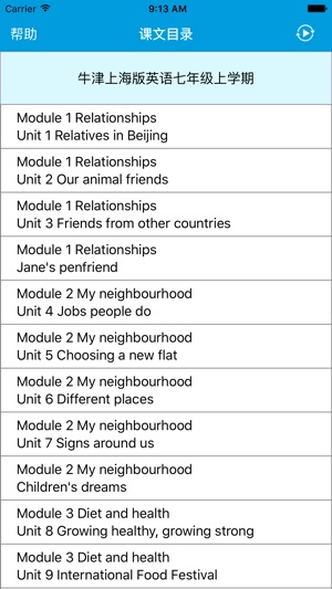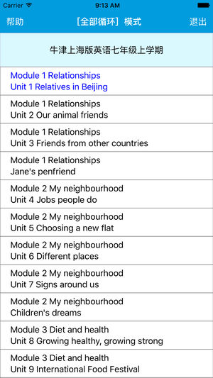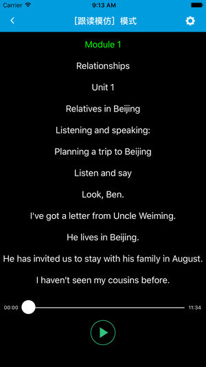 本应用对应牛津上海版英语小学七年级上学期课本。 该应用支持跟读模仿,单次播放,单课循环,全部循环和听写的五种模式。它实现了实时评价用户跟读模仿的发音,并根据评价结果决定是否重新跟读。它以盲听跟读为设计原则,用户不需要反复触摸录音播放按钮,而是一键跟读,高效地练习口语。它还实现了单课循环,全部循环和智能分段功能。其中,智能分段可以让您免于寻找回放点,提高听音效率。在听写模式下,它提供了快速,常速和慢速三种模式供您选择。它贯彻了跟读模仿练习英语口语和通过听写练习英语听力的有效学习方法,让更多的学生摆脱哑巴英语,促进听力和口语相互提高,助力英语听力口语考试。