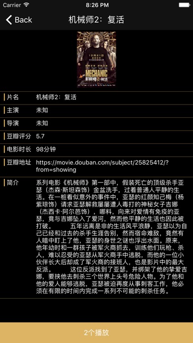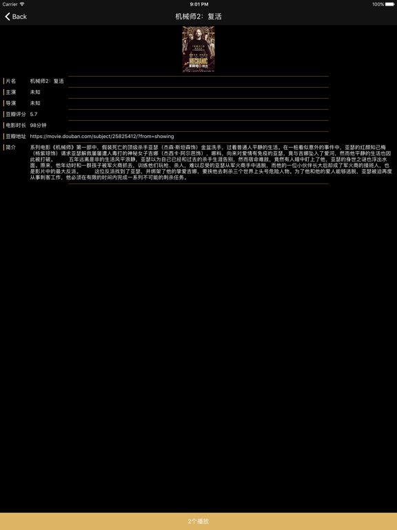 想第一时间知道上映电影在网络上有播放资源? 想不去电影院就能看各种高清最新电影? 想一有最新电影在线播放就有推送提示? come on baby!! 功能介绍: 1,上映电影列表,可以查看正在上映的电影,查看是否有播放资源,如果有播放资源则可直接播放。 2,所有可播放电影,查看所有有播放资源的往期电影。 3,搜索,搜索电影库,找到你最喜欢的电影。 4,电影详情,可查看电影资料,电影评分等,让你不去看烂电影。 5,推送,推送最新可播放的电影。