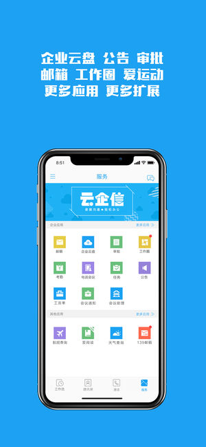 云企信是一款面向企业通信和信息化需求的软件客户端,覆盖手机、PC等多款终端,是对传统融合通信业务的优化与创新。 云企信为企业提供一体化移动办公协同服务,帮助员工在任何时间、任何地点,使用任何终端,进行高效的沟通与办公,助力企业降本增效。 云企信提供企业通讯录、即时消息、办公应用等移动办公服务,帮助企业成员进行高效沟通办公。