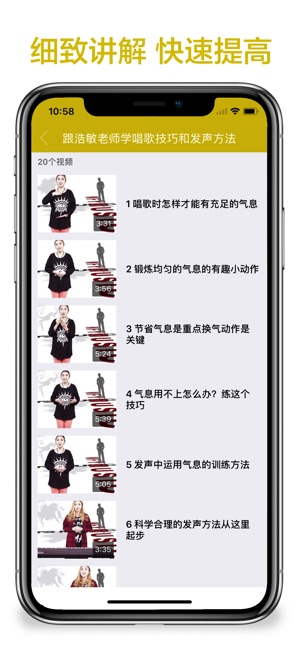【汇集海量唱歌教学视频,轻松学唱歌,为你打开艺术之门】 收录大量教学视频,可以帮助广大声乐爱好者从零基础开始专业学习现代流行唱法的知识和技巧,通过练习逐渐进行入门提高。科学系统的为您解决高音上不去、低音下不来、气息不够用、音色不好听、唱歌容易累、感情不到位、五音不全等问题,全面提高你的唱歌水平。 细致讲解,跟音频练习,帮助你解决高音上不去、低音下不来、气息不够用、唱歌容易累、音色不好听、没有表现力的问题。简单学几招,让你在K歌时大显身手。 爱唱歌的各位麦霸现在就拿起你的麦克风跟我们一起唱歌喊麦做发声练习吧,让我们一起用心歌唱,追逐梦想!