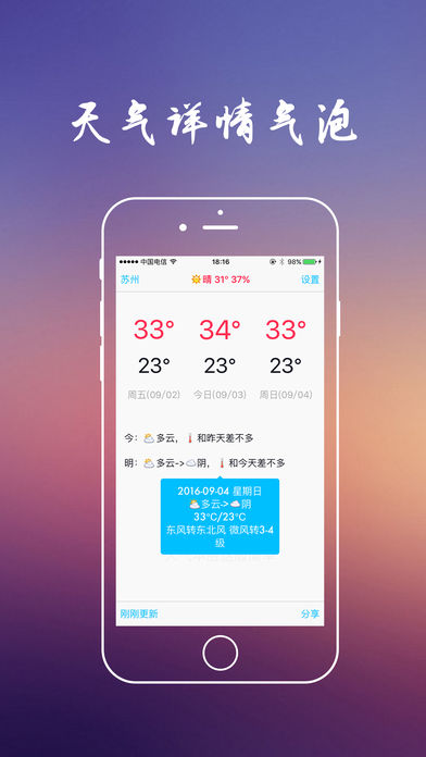 ——————————— !!!特别注意!!!: 很抱歉,本软件只支持少量国外城市,建议国内用户使用。 ——————————— 是否厌倦了花花绿绿的界面? 是否厌倦了乱七八糟的信息? …… 而这些对您的帮助微乎其微,反而浪费了您的时间精力,浪费了设备内存和存储。 天气预报本应该是——简洁的!精准的!高效的! 但是,很遗憾,市面上并不存在…… 然而,您不要感到无奈和沮丧,因为真的被您找到了!在您眼前的就是这么一款天气应用: 小巧轻快(安装快,启动快,存储小) 原生简约(界面清爽,与系统融合) 高效实用(只提供最有用的信息) 本应用使用最精致的算法,为用户提供最直接明了的天气信息。 如果您认同本软件的设计理念,并且正需要这样的软件,请不要犹豫~ 如果您不喜欢,请您去下载其它高级、复杂的天气应用,满足您的需求~ 在使用中遇到任何问题,或者有创意性的建议,请在评论中留言,每条我都会认真查看~如果不想公开您的言论,可以从APP的“设置”-“反馈”给我发送邮件。 如果您喜欢本软件,请抽出一点宝贵时间,给个好评,留下您的足迹,让我知道一下有您的支持~谢谢!