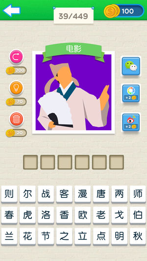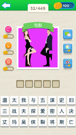 免责声明:猜电影是一款看图猜电影名的娱乐游戏! 电影大冲关,一答到底! 快来猜电影吧!挑战一下你看过多少部欧美大片和经典电影!看看你能不能猜出所有电影! √ 有趣好玩!数百关卡等你来通关! √ 持续更新! 每月更新新电影! √ 与好友一起分享乐趣! 支持微信和微博问朋友,让朋友来帮忙解答的同时,也可以考考朋友! √ 数百部高分高评价电影等你来猜! √ 大量金币奖励等你来拿! 赶紧下载,加入《猜电影名 -电影达人也疯狂》的挑战之中吧!