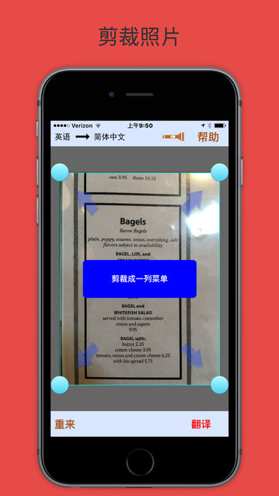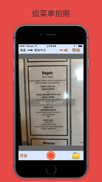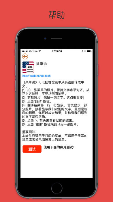 《菜单说 (免费版)》把菜单从英语翻译成中文。 让英语菜单点菜更容易。拍照,剪裁,然后翻译。就这么简单。每行英语单词后面紧跟着识别的文字和翻译,让你可以更容易的和服务员交流。 本程序可以免费使用三次,使用时不需要网络连接。但需要有网络才能购买,无限使用。请在出行前购买好。 为什么选择《菜单说 (免费版)》? - 它不仅是单词翻译,而能帮你更容易的点菜。 - 菜单上的每一行都伴随着翻译。当你找到要点的菜的时候,你可以更容易地和服务员交流。 - 它很可靠,能识别绝大部分打印的菜单。 - 它不需要网络连接,所以可以在任何地方使用。 - 它的界面很简单,让你第一次就能上手使用。你也不用担心需要重新学习如何使用它。 - 使用了粗体字,让你更容易读。 更多信息: - 《菜单说 (免费版)》只适用于打印的菜单,而不能用于手写的菜单或者电脑屏幕上的菜单。 - 剪裁菜单成只有一列的 - 从正上方拍照,尽量不要有倾斜角度。 - 为了更好的结果,可以把菜单放在桌子上再拍照。 已知的问题: -对于大部分的菜单,《菜单说 (免费版)》会有一小部分的文字无法识别或者识别错误。 - 我们尽量做到最好的翻译。但是语法很多时候都不是很完美。 - 如果字体太小,《菜单说 (免费版)》在识别的时候会有困难。