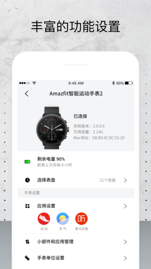 华米手表App是华米Amazfit运动手表连接手机的必备应用,Amazfit运动手表必须要通过它来绑定激活才可使用。 更多功能如下: 1、身体数据展示 手表中产生的步数、睡眠、心率等数据可以同步到App中,并在App中可以浏览详细数据; 2、运动数据分析 支持手表的所有运动记录同步后的展示,可以查看详细轨迹、各种运动数据的变化曲线; 3、手表管理助手 提供手表的通知管理、表盘更换、小部件排序等功能的设置; 如对华米手表App有任何建议或意见,可在应用中点击提交意见反馈,我们会认真对待每一条反馈,与你进行真诚地沟通。