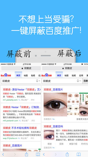 iPhone,iPad版的广告拦截神器,可能是iOS系统上上最好最强的广告过滤app。 逛网页,屏蔽百度推广,不再上当受骗!屏蔽网页图片,网络文字,节省流量!支持Safari浏览器多项内容屏蔽。 看视频,片头广告2分多钟太变态?打开视频广告屏蔽,不再受广告困扰!!支持优酷视频,搜狐视频,芒果tv等广告拦截。