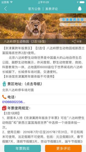 亲子年票官方APP,各城市用户可在APP中直接购买电子年票并绑定,即买即用;还可把未使用过的实体年票绑定为电子年票,绑定后实体年票自动失效。APP可随时查看各场馆景区介绍规则及更新公告,还有实时导航、直拨电话、在线客服、我的足迹、发表评论、查询快递等功能。