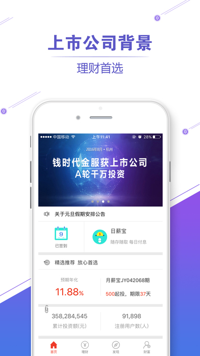 钱时代--手机理财神器 以大数据作为技术支持,为投资者提供优质、安全的理财产品。 年化收益率8%--15%,100元超低起投门槛。 高收益、低门槛、投资周期灵活的互联网与金融中介综合性服务平台! 新人福利 注册即送888元新人红包,新手专享20%年化收益特权项目! 7重安全保障 --回款保障 --资金保障 --产品保障 --风控保障 --法律保障 --技术保障 --透明保障 联系我们 客服热线:400-782-0088 官方微信:钱时代金服(qianshidai666) 服务邮箱:service@qsdjr.com 官方网址:www.qsdjf.com