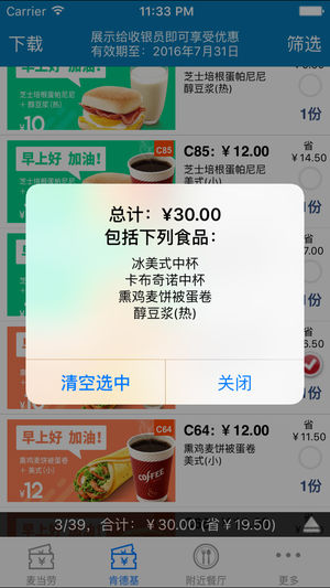 小巧方便的必备app,可以离线使用 出示手机,展示给店员,即可享用【麦当劳】【肯德基】电子优惠券折扣! *App内优惠券信息,均来自中国大陆地区肯德基和麦当劳官方网站。 *经用户认证,在中国大陆地区除交通枢纽等特殊门店外,均可正常使用! *每月与官方第一时间同步,保证用户第一时间享受到最新优惠信息。 *全国通用,所有肯德基麦当劳门店均可使用!(机场、火车站、高铁站等地方除外) *附近餐厅功能