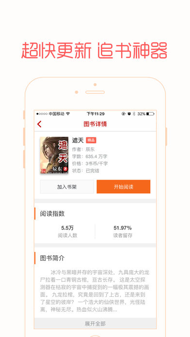 最专业的小说阅读器 他有着最丰富的小说资源,最优质的小说内容,最全面的小说类型,最舒适的阅读体验,只为成为你身边最亲密的阅读小伙伴儿。 【特色功能】 海量资源:来自互联网海量小说搜索资源,即搜即得; 优质内容:大量完结、连载、出版小说,同时提供高品质听书资源,品质最优; 全面的小说类型:玄幻、都市、言情、武侠、科幻、军事、职场励志,应有尽有; 舒适的阅读体验:多种阅读主题、夜间模式、翻页效果,随意切换阅读页横竖屏; 实时的小说更新:连载小说,更新提醒,第一时间获取最新章节,随心阅读; 电脑传书:电脑手机同时阅读,支持EPUB、PDF、TXT、UMD格式,想传就传; 完美支持iOS10,适配iPhone7 、 iPhone7 Plus和iPad。