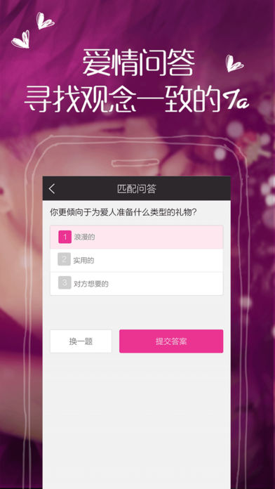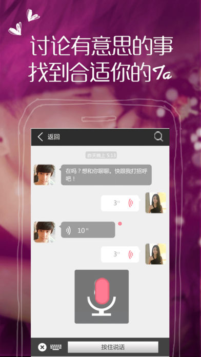 约会吧,瞬间发现心爱的TA...... 一款专为同城附近单身男女打造的情感交流平台,令孤单的你,最快的迎来一次次浪漫的约会。你可随时利用自己的碎片时间,在任何时间任何地点,第一时间联系心仪的TA,并且可查看身边的异性,全面的资料展示,身份认证,视频认证,个人资料审核,确保会员的真实性,让你离幸福更进一步。 基本功能: 1.支持文字、语音、图片、表情,轻松畅聊; 2.实时获取地理位置,偌大的世界,总有一个位置属于你; 3.个人设置:根据个人情况设置个人信息。 特色功能: 1【附近的人】 一键搭讪身边人,最快约到心动TA! 2【条件查看】 AA,是否请客均清晰明了,告别酒托饭托,告别被骗! 3【信箱管理】 为你归档信件,单独排列最近联系的人,对杂乱说再见! 【温馨提示】: 1.拒绝传播淫秽色情信息,遇到色情信息请举报; 2.和陌生人线下约会时,请注意安全; 建议您在WIFI条件下使用,土豪请随意!