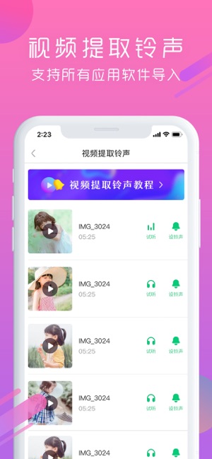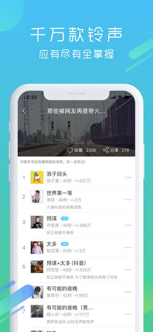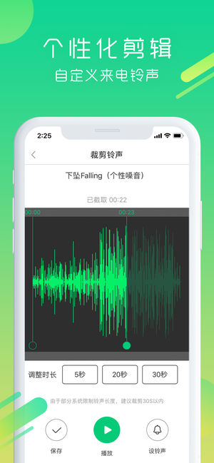 最全手机铃声曲库,海量手机铃声,免费使用,手机必备。 铃声、闹铃、来电、短信,一键设置,10秒快速设铃声。 《快速设铃声》 无需链接电脑,手机快速换铃声,100%设置成功,再也不用担心分不清谁的手机响啦! 《视频提取铃声》 视频背景音一键提取,任意音乐APP铃声均可设置! 《推荐铃声》 整合时下最热门、最潮、最新的铃声,“薛之谦、鹿晗、邓紫棋…”,时刻紧跟当下潮流。 《精准搜索》 具备酷狗海量铃声曲库,想听什么,就搜什么。 《种类齐全》 热门流行、搞怪、影视、动漫、短信、闹钟、DJ,应有尽有。