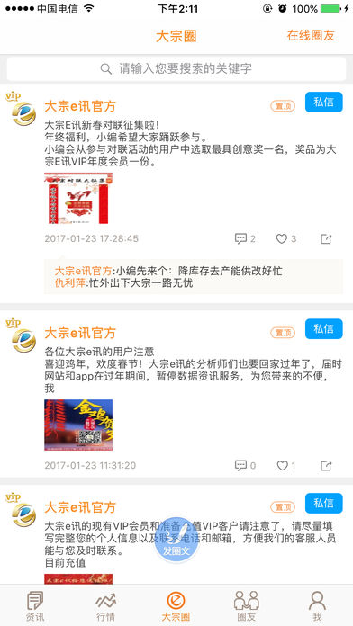 概况 大宗e讯不仅为用户及时提供大宗商品资讯、数据、策略、和线上贸易撮合服务,更让用户可以直接参与发布行业资讯和商品供求,简单、快速、直接、专业让每个行业内的客户参与其中,收益其中,平台还为行业内客户提供船运供求信息旨在从物流方面帮助平台用户,我们关心大宗商品行业内的每一个细节。 特点 平台通过同名App、网站、微信公众号和微博为行业用户提供服务。每天推送的资讯内容快速、真实、准确,并提供专业、自由的交易模式,整合行业内的客户资源和数据,为行业内各方提供最专业的一站式平台服务。创新的大宗行业加上互联网模式,您不仅是任何资讯数据的获得者,更可以直接成为发布者,与他人分享,实现资源互补。 主要功能 1,网罗大宗商品最新资讯 国内外的大宗商品资讯一网打尽,更是细分到各个产品(镍、锡、铜、铝等等),多达17种,致力打造最新、最快、最详细的大宗资讯,提供您阅读 2,订阅“作家” 大宗e讯“订阅”,聚集了一批拥有丰富经验以及独到眼光的编辑作家,提供个性化的阅读服务 3,资讯随时发 如果您也有相关内容想要发布,大宗e讯给您提供最好的平台,把您看到的、知道的,随时拿出手机写下或拍下,与业内人士一起分享及探讨