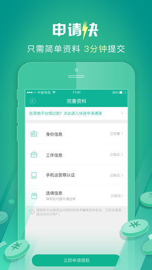 哎呀,这月工资花完了,要急用钱,手头紧!该上哪儿借点钱花? —— 借钱快,小额借钱神器,应急周转,找我就好! 【核心功能】 1.审核神速,现在申请,马上就能借到钱! 2.操作简单,手机上填资料,获得借款额度。 3.借钱金额500-5000元,还钱期限7-30天,灵活选择,低息多优惠,轻松无压力。 4.门槛低,证明有月收入,就不怕没钱花。 【我们承诺】 1.安全可靠 2.严格保护隐私,绝不骚扰 【联系我们】 微信公众号:“借钱快”(公众号ID:jieqian99)