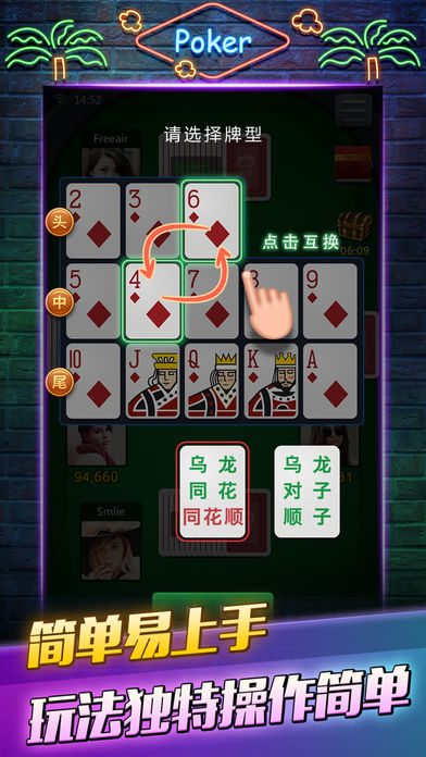 ---游戏简介--- 风靡全国的经典十三张游戏 玩法多样,体验精彩 随时随地,想玩就玩 万人在线,高手云集 登录就送海量金币 ---游戏特色--- 1.免费超快下载,无需注册,占用空间小,不耗电量 2.独特竖屏游戏画面,精美简洁,看的让人舒心畅快,玩牌时更能减少疲劳的感觉 3.专业顶尖的防作弊系统,让你不用担心任何作弊问题,安安心心,舒舒服服地打个牌 4.规则简单明了,富有娱乐性、对抗性,挑战多多,欢乐多多,马上开始游戏吧!