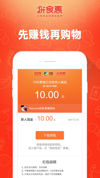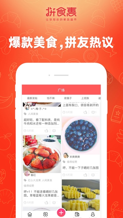 拼食惠主要围绕吃货服务的平台,根据您的喜好为您推荐新奇商品。您更可以在广场晒出你的吃货记录,让您成为一名吃货大咖。