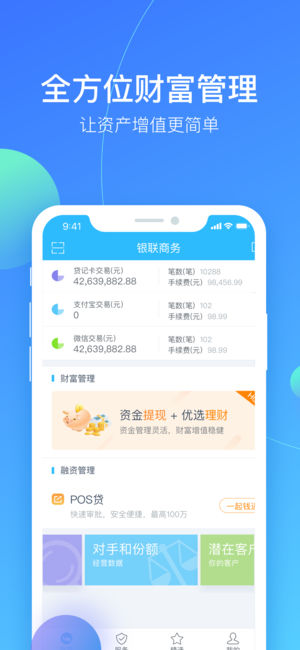 银联商务App是银联商务股份有限公司全新打造的O2O商户综合服务平台。目前,银联商务App已集成移动收款、理财贷款、银杏信用体系、账务服务、差错处理、POS服务、业务办理以及收银员培训等各种基础服务。作为开放的互联网生活平台,银联商务App以移动互联网技术和智能设备为依托,以商户实时需求为导向,为商户提供综合全面的移动端服务,让支付生活更美好! 主要功能: 【丰富功能,轻松查询】 清晰完成每日对账,交易日期、交易金额、交易类型及手续费等一目了然; 即时提现、资金理财及商家贷款,金融服务一站式解决; 二维码收款、银行卡收款及银联云闪付,移动收款,想收就收; POS机在线申请、极速配送、…