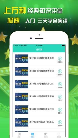 演讲技巧,是演讲的道中之术。技巧的提升,需要重复大量的训练和复习才会不断将技术性的力量提升到艺术性。所以,演讲技巧,是演讲爱好者们必须学习和锤炼的技能。 如何进行好一次成功的演说,必须要做好充分的准备和演练。而演讲稿总是需要体现一定的自身特点的,经过专门的训练能写出观点鲜明结构清楚的文章。 但是你知道该如何把握好自己的声音语气,从而表达出最好的感染效果呢?来下载该应用吧!让资深的演说家为你拨开迷雾,震撼你的听觉世界!