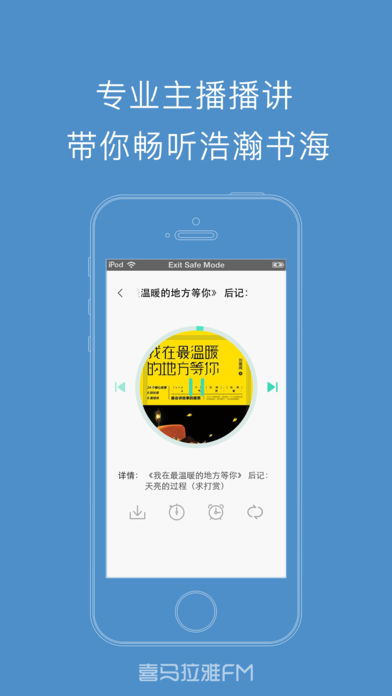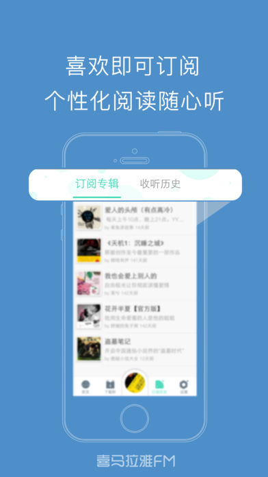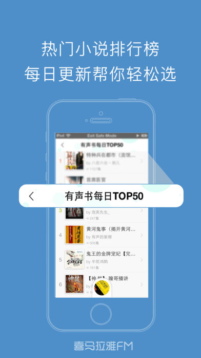 掌上听书神器,海量图书免费听 。 喜马拉雅FM官方出品,畅听百万有声书。 多种分类任你选,爱书之人必备追书神器。 释放双眼,放松心情,带上耳机穿梭在浩瀚书海。 悬疑,言情,玄幻,历史,武侠多种分类随心听。 最优质的主播,高清音质,亿万书友的选择。 ---------------【听书神器.内容简介】--------------- 悬疑:让你无法逃脱的心底深处的恐怖。 言情:最丰富的爱情小说,听你最想听的爱情故事。 幻想:搜罗当下销量最高的玄幻小说,尽显有声玄幻魅力。 历史:多部经典巨作,历史名人传记,为您多方位解读历史。 文学:古今中外名著精选集,带你领略文学的魅力。 武侠:金庸,古龙,梁羽生,用声音圆你武侠梦。 官场商战:探秘中国式官场文化,中国当代官场的百科全书。 经管:收录了时下 经济类图书,使您在闲暇之余,也能够轻松掌握财经、经济学的脉络。 社科:社会科学,名人自传,一起探讨社会热门话题,解读当下。 ...... 对于产品如有任何疑问和建议,请联系我们 网站:http://www.ximalaya.com 客服QQ:4008385616 新浪微博:http://weibo.com/ximala 腾讯微博:http://t.qq.com/ximalayacom 客服电话:400-838-5616
