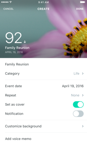 Dreamdays 4.0来啦!伴随着迄今为止最大的设计升级。拥有Dreamdays,你可以看到你的重要事件被时间或分类依次展示,同时你还可以为你的事件配上心仪的背景图片或是一份语音记录下的心情。当然,和朋友们分享你的喜悦也是必不可少的,快通过Dreamdays内置的Facebook,Twitter,Instagram分享给你的好友们吧! 主要功能: - 倒数你的事件,或是正数已经过去的事件 - 天数与年/月/日展示模式并存,更好的展示您的事件 - 最新支持精确到秒的事件倒数,更细致的记录重要事件 - 六种自带精美图标的默认分类(纪念日,生日,节日,生活,学校,还有旅行);当然,你还可以自由…