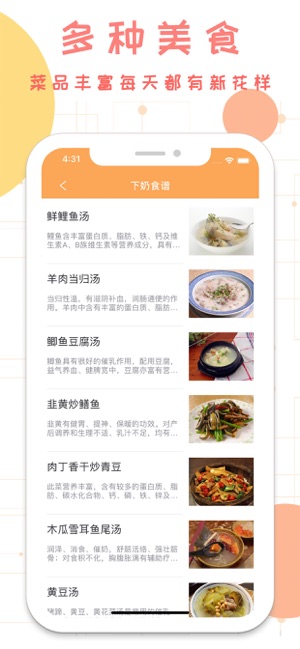 经历十个月的辛苦怀胎,健康可爱的宝宝终于降临!可宝妈们的身材却做出了巨大牺牲,怎样既健康又快速的恢复完美身形? 月子食谱为处在坐月子期的妈妈提供健康营养的饮食搭配,让您的身体以最快速度恢复完美! 每道菜谱有具体的简介,材料,做法,让您吃的安心!