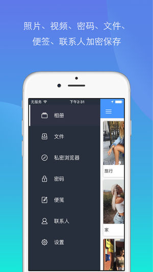 狮子隐私管家可以把你不想被人看到的图片&视频加密保存,你再不用担心被人发现不该被看到的图片&视频。 狮子隐私管家因下列理由而成为绝佳的相片视频保险箱: 1.安全 • 提供伪装密码,当您被强迫输入密码时, 输入伪装密码可展示一些无关紧要的照片或视频 • 提供登入报告,偷窥者的每次登录(不管是否成功)都会被记录下登录时间,并拍下照片。 • 提供翻转手机锁定,紧急情况下,只要将手机翻转到面朝下就可以锁定相册 • 提供摇一摇锁定,紧急情况下,摇一摇手机锁定 • 内置无痕浏览器,浏览网页不留痕 • 支持同时保存照片、视频、文件、密码、便签、联系人私人信息 2.方便快捷 • 通过WiFi就可以实现…
