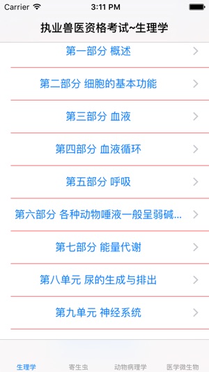 *****职业兽医考试,找应用,给力推荐《执业兽医资格考试知识点总结大全-生理学|寄生虫|医学微生物|动物病理学》***** 内容涵盖: *****生理学 1.第一部分 概述 2.第二部分 细胞的基本功能 3.第三部分 血液 4.第四部分 血液循环 5.第五部分 呼吸 6.第六部分 各种动物唾液一般呈弱碱性反应。 7.第七部分 能量代谢 8.第八单元 尿的生成与排出 9.第九单元 神经系统 10.第十单元 内分泌 11.第十一单元 生殖与泌乳 *****寄生虫 12.名词解释 13.简答 14.流行病学 15.预防 *****动物病理学 16.第一单元 动物病理学概论 17.第二单元 组织与细…