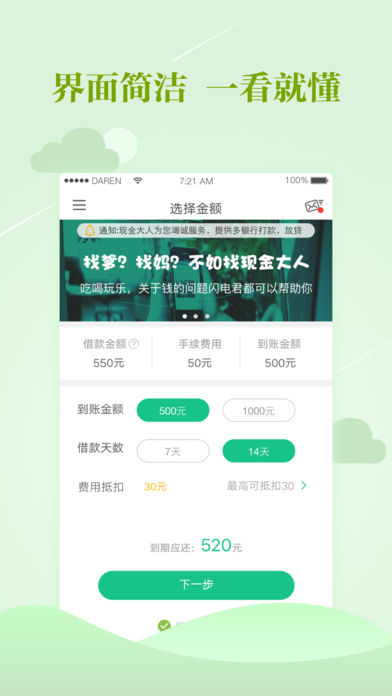 【Pro版用户享有优先审核权!】 【现金大人-年轻人的现金钱包】 无需任何担保和抵押 在线申请,快速放款 让你随时随地马上有钱 【功能特点】 1、资料简单:只需要身份信息和手机号,纯线上操作; 2、极速到款:3步审核,最快5分钟放款; 3、还款便捷:还款提醒服务,APP一键还款。 【团队介绍】 团队集合了外企服务多年的高管人士、国内外著名大学毕业的专业技术人才、以及银行服务多年的资深顾问。 立志将国外先进的金融生活方式引入中国,在国内“普惠金融”起步初期,为社会贡献自己的一份力量。 产品上线同时即获得国内顶级天使投资。此后稳扎稳打,不忘初心。 【联系方式】 有任何问题,请不要犹豫,我们客服妹纸随时欢迎您的咨询。 官方网站:http://www.sdzz.la 微信号 :xianjindarenguanfang 客服电话:4008780213
