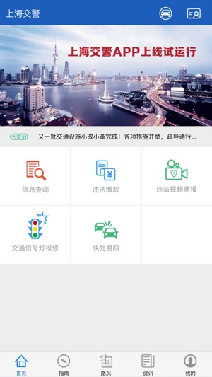主要功能: 1.交通违法行为信息查询; 2.交通违法行为在线处理; 3.已处理违法行为在线缴款、扫码缴款(支持所有银联卡); 4.违法行为视频举报; 5.一键挪车; 6.交通信号灯故障报修; 7.机动车/驾驶证所有人联系方式变更; 8.交警业务办事指南与地点导航; 9.实时路况及出行路线规划; 10.交通事故快处易赔; 11.交警资讯。