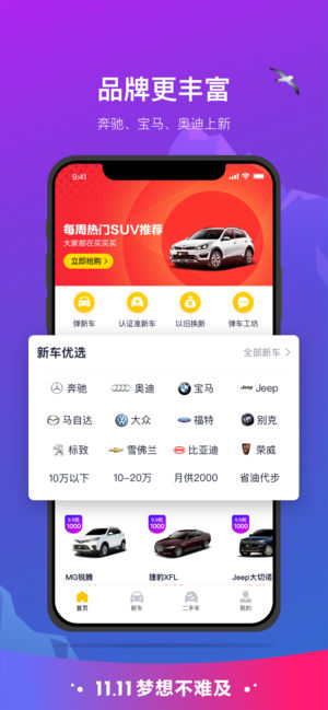 弹个车——大搜车旗下全新汽车金融产品,阿里巴巴和蚂蚁金服联合战略投资。 【1成首付,0保证金】 拒绝传统高首付,弹走你的购车门槛! 购车首付只需10%-20%,含购置税/过户费,送1年保险。选择空间更大,资金占用更少。 (首付比例基于蚂蚁金服信用体系评估,信用越高首付越低) -----满一年可买可退----- 在弹个车买车,用满一年自由选择继续租车、全款购车、分期购车、退还车辆。可买可租可退,弹出个性。 -----购车尾款可分期----- 购车车款期末可一次付清,尾款最长可享三年分期,弹走压力。 【信用购车,全程包办】 -----信用购车,先用后买----- 不需额外保证金…