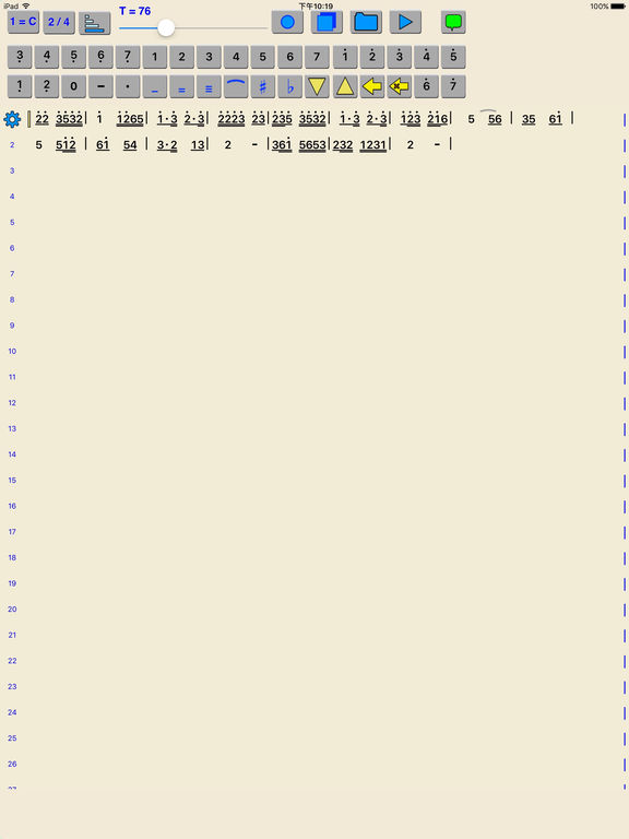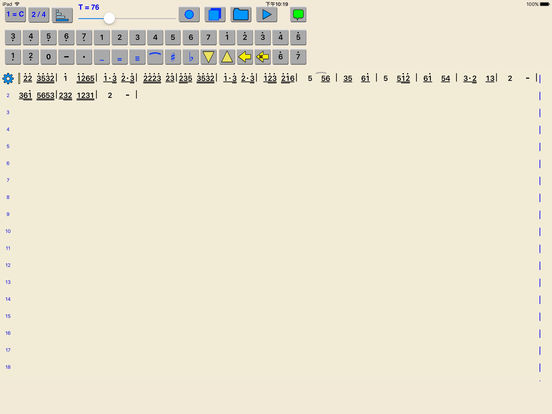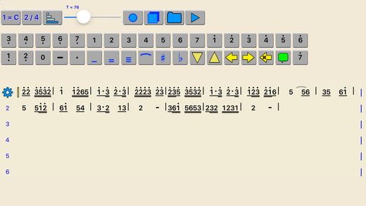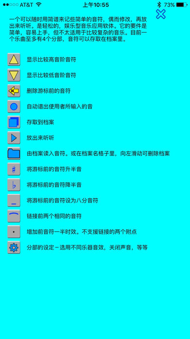 一个可以随时用简谱来记些简单的音符,偶而修改,再放出来听听。是轻松的,娱乐型音乐应用软件。它的要件是简单,容易上手,但不太适用于比较复杂的音乐。目前一个乐曲至多有4个分部,音符可以存取在档案里。
