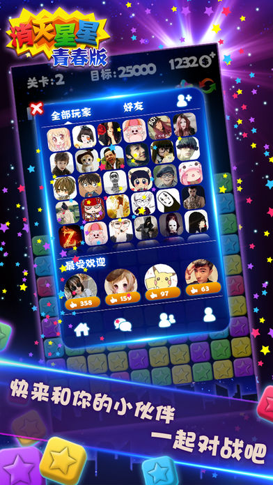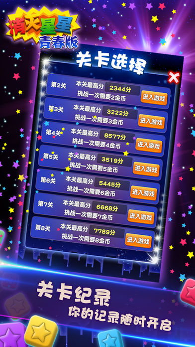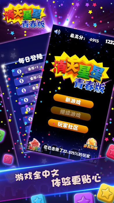 ◆消灭星星App Store下载最多的休闲游戏 ◆在许多国家手机游戏排名第一 ◆史上最完美的消灭星星 ◆特色1.无关卡限制 自动保存 ◆ 2.新道具 实用的接关功能 ◆ 3.画面和可玩性优于任何一款同类游戏 让我们做一个最懂你的消灭星星游戏 世界排行榜 跟好友一起挑战消灭星星最高分吧 点击2个或更多颜色的星星进行选择 再次点击选择的星星进行消除 同色的消灭星星越多,得到的分数越多 谨慎选择,冲击最高分消灭星星