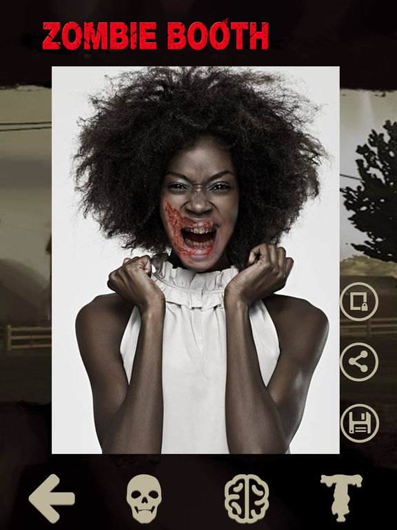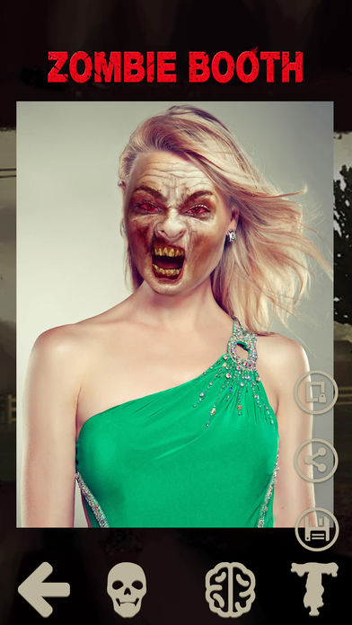 僵尸相机可以改变你的脸变成僵尸脸,让你分享与家人或朋友的照片 ===特点=== *50+僵尸脸图片 *自由添加文本 *50+僵尸贴纸 *通过Facebook,Twitter,电子邮件或信息分享图片。