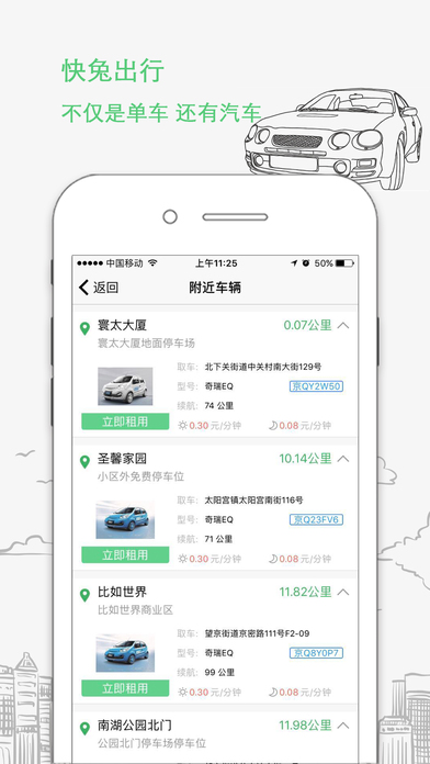 快兔出行是移动互联网+电动汽车+单车的O2O分时租赁共享平台,全部业务流程通过移动互联网一体化实现,真正做到为用户提供便捷的分时租赁服务,绿色能源的电动汽车、无污染的自行车,完美的解决了用户最后一公里的出行问题。有快兔,出行变简单! 温馨提示:快兔出行的导航功能在使用过程中会持续使用GPS定位服务,切换至后台时,仍会继续,相比其他操作会消耗更多的电量,并影响电池续航时间。 Continued use of GPS running in the background can dramatically decrease battery life.