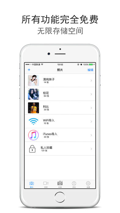 史上最好用, 最强大的隐私保护App,为您加密存储照片、视频、账号、日记、联系人。 加密相册是怎么运作的? 第一, 作为一款保密应用, 您最关心的应该就是安全问题了, 加密相册提供多重保护机制, 确保您的秘密安全存储: √ 支持登陆密码——需要登录密码才能访问应用内数据 √ 支持文件夹密码——每个文件夹都可以单独加锁 √ 支持伪装密码——输入伪装密码时,只显示一些无关紧要的照片和视频 第二, 作为一款人人称道的好工具,怎么能处处设限、收费? √ 无限存储:无数量、无容量限制,想存多少就存多少 √ 完全免费:无任何功能限制,尽情享受所有的贴心设计 第三, 作为一款功能强大的隐私保护工具, 加密相册还有许多您意想不到的特色功能: √ 支持加密存储:照片、视频、账号、日记、联系人 √ 支持iTunes/Wifi批量导入导出照片/视频 √ 支持通过Email发送加密照片pdf √ 支持分享照片到社交网站:微博、微信、facebook、twitter 您还在等什么? 只要下载即可拥有如此强大、功能丰富的免费加密App, 从此不再惧怕隐私照片、视频、账号、日记、联系人被其他人看见了! ______________________________________________________________________________________ 如果您有什么建议,请联系:wangping_app@sina.com或qq:673368731.官方技术支持qq群:331210536