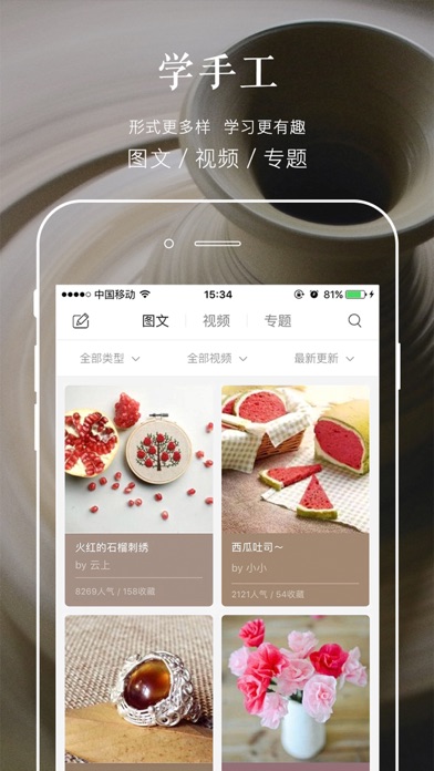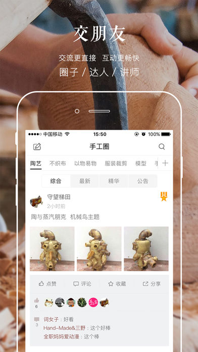 告别淫雨霏霏季节,蔓延着夏的温度。希望生活的忙碌不曾搁浅昔日的梦想,快来手工客,告别都市的喧嚣,体会手作的美好。手作特训营精选各个类别顶尖手艺人,言传身教,贴身指导,让手工学习更深入更直接。 手工客:中国领先的手工DIY爱好者社区。动手的实践,心灵的修行。手工客网((shougongke.com))倾力打造。手工爱好者必备应用,图文教程+视频+线下课拾艺学堂+手工市集,学手工,秀作品,结交名师。买材料买工具,定制手工礼物。 ——【手工客内容简介】—— 1、图文教程:布艺、皮艺、折纸、剪纸、木艺、饰品、编织、刺绣、雕塑、雕刻、模型、橡皮章、羊毛毡、旧物改造、美食、烘焙、园艺、多肉、粘土、陶艺、手绘、印染、滴胶、热缩、金属工艺、电子科技、手工护肤,20大分类,50万篇手工教程,极具人气的手工diy应用。 2、视频教程:绘画书法、美食、烘焙、竹艺木艺、粘土陶艺、插花、园艺、服装裁剪、刺绣…海量免费手工视频,手工达人亲手录制,就是要你好看。 3、手工圈:首饰、金工、串珠、印染、玉石、漆器、模型、乐高、手工皂、陶艺、手账、服装裁剪、古风首饰、银饰、热缩、沙龙活动、以物易物、结绳、琥珀、文玩设计、衍纸、北京锣鼓巷、多肉、绕线、微缩世界、不织布、传统手工艺、人形娃娃、雕刻雕塑、刺绣、护肤美妆、拼布、剪纸、美食烘焙、滴胶、亲子手工、电子科技、羊毛毡、钩编、园艺花艺、软陶粘土、手绘、橡皮章、旧物改造、发饰、纸艺、木艺、皮艺、布艺,50多个专业手工圈,在这里,与700多万手工爱好者一起学习、分享、交流,不亦乐乎。 4、手作市集:饰品、包包、皮具、银饰、鞋靴、配饰、家居日用、数码周边、玩具玩偶…我们为你用心挖掘精致的手作、优质的手工店铺,让你快速找到心仪的手作。 5、材料商店:布艺、皮艺、纸艺、编织、饰品、木艺、羊毛毡、橡皮章、粘土陶艺、园艺多肉…海量材料包、配件、工具,应有尽有,你想要的都在这里。 6、手作特训营:顶尖手艺人贴身指导,言传身教,学习效果更好。 7、手作众筹:精选手艺人好作品,众筹支持。 8、手作团购:精挑细选最好的材料和工具,让你做手工更便捷。
