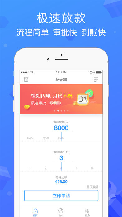 描述: 【花无缺上班贷】--年轻人手机借钱贷款,工薪阶层凭借信用,即可轻松申请借款,最优借贷平台和工具。提倡“在理性额度内提前消费”理念。拥有独创的多维度风控系统,并结合互联网大数据,以及对接各大征信机构信息库,为用户提供银行级别的安全保障。 产品优势 1、超低门槛:【满18周岁】国内社保连续缴费三个月以上的工薪阶层; 2、超速借款:线上快速认证,审核一通过,立刻到账; 3、额度灵活:提供500-8000元、1-6期的分期借款服务; 4、借贷安心:银行级安全系统保障个人隐私,让你安心借贷; 产品特色 1、免打扰信用认证模式 全程在线认证审核,无需登门核实身份,利用先进的互联网数据分析技术,快速准确地完成信用认证,真正意义上做到了免打扰。 2、极速提现 有强大先进的征信技术做支撑,5分钟完成信用认证。一旦认证通过,即可到帐,用户随时随地都可极速提现。 借款步骤 第一步:下载APP并注册 第二步:填写个人信息并上传证件 第三步:提交审核 第四步:贷款审核通过 第五步:贷款现金到帐 联系我们 客服热线:400-990-3388