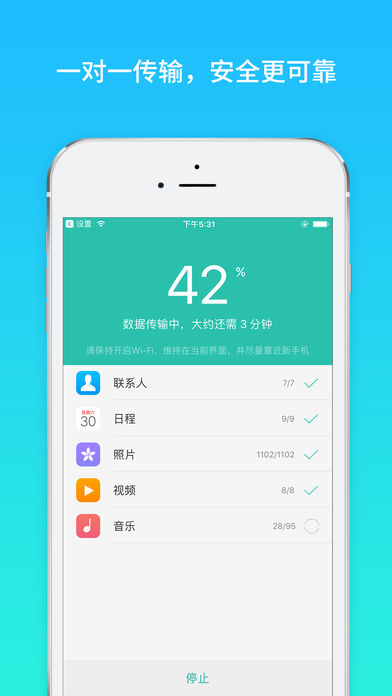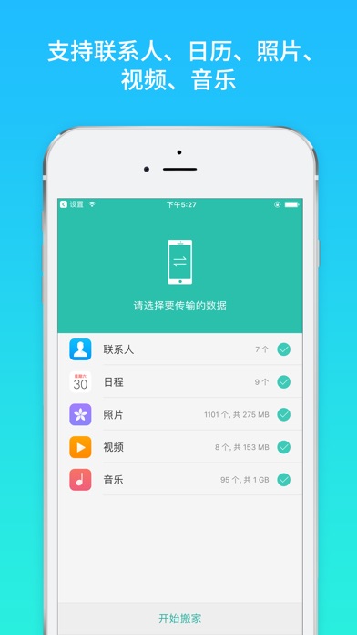无需耗费流量,让您的旧手机数据快速、安全地迁移到新手机上。 【支持五大类数据传输】 支持联系人、日历日程、相册、视频和音乐五大类数据,全面迁移旧手机资料。 【无需连网,消耗0流量】 手机搬家功能通过两个手机Wi-Fi互连来传输数据与资料,无需消耗任何流量。 【点对点传输,快捷又安全】 无需电脑、连接线等设备和网络,直接将数据与资料传输到新手机,免去了繁琐的步骤和隐私泄露的烦恼。
