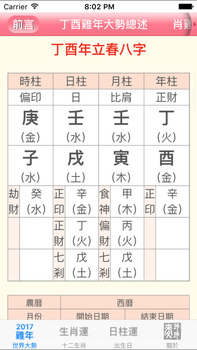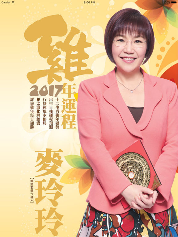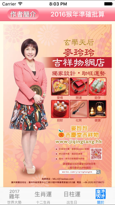 内容包括2017鸡年世界大势总述、肖鸡大解说、鸡年十二生肖运程、「个人出生日」运势预测、犯太岁化解锦囊、鸡年行好运风水佈局、鸡年吉凶方位、家居全方位风水阵、简易风水阵、办公室秘密风水阵、过年习俗知识、鸡年吉时吉日、每日通胜、繁简体转换功能。 作者简介: 麦玲玲自幼跟随名师学习术数,对手相、面相及子平八字等术数均甚有研究,尤其精於推算姻缘。麦玲玲除了为多间著名机构担任风水顾问,也时常应邀到国内及东南亚各地作风水勘察,乃全国最受欢迎堪舆学家之一。 麦玲玲多年来常接受媒体采访,并在各大报章杂誌先後撰写过不同的风水命理专栏,包括《东方新地》、《U Magazine》、《东周刊》、《太阳报》、《头条日报》、《南方都市报》、《羊城晚报》、《安邸AD》及《时尚‧COSMOPOLITAN》等,更多次获邀担任各大电视台及电台的节目嘉宾,如电视广播有公司(TVB)、香港有线电视(Cable TV)、湖南卫视、凤凰卫视、广东卫视等等。 麦玲玲著作甚丰,除一年一度、读者翘首以待的流年运程书外,其他已出版的著作还包括《面相天书(岁数篇)》、《置业风水天书》、《玄学速解大全》、《女人都是这样谈情的》、《爱情自救》、《家居开运》、《生肖百科》、《嫁得好》、《好运99》、《礼俗文化大全》及《好房子‧好风水 设计手册》等玄学专书,更配合时代步伐,推出电子运程书以供下载,广受欢迎。 为推广正确的风水知识及满足广大需求,麦玲玲近年更自设吉祥用品网店及实体店「吉庆堂」,全国只此一家,以求广结善缘,帮助各人趋吉避凶。 相馆地址:香港中环德辅道中20号德成大厦13楼1309室(中环地铁站C出口) 预约电话:(852) 2868-9499 图文传真:(852) 2501-5788 电邮地址:88@maklingling.com.hk 官网: http://www.maklingling.com.hk 微博:http://weibo.com/88mailingling 麦玲玲吉庆堂官网店:http://www.jiqingtang.hk 麦玲玲吉庆堂淘宝店:http://mlljqt.taobao.com 麦玲玲吉庆堂广州店:广州市越秀区中山叁路33号中华广场首层1053铺