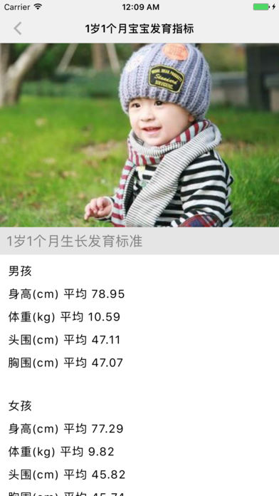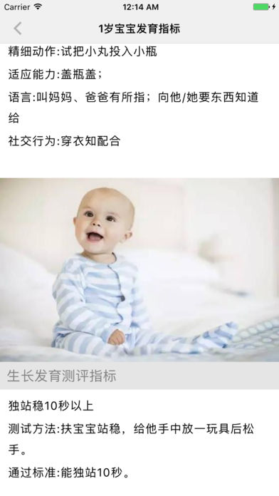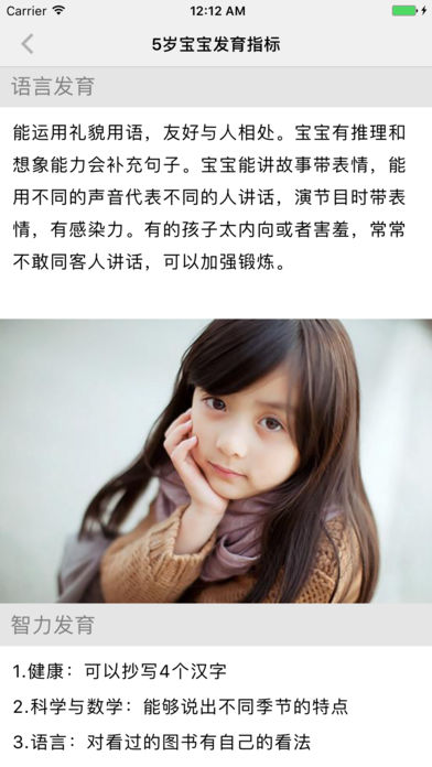 是不是觉得当了爸爸(妈妈)之后,发现很多育儿知识都来不及准备:宝宝发育的是否正常呢?宝宝为什么黄疸偏高呢?宝宝的身高是否超出正常范围呢?什么时候该打疫苗了?这个阶段的宝宝要怎样进行启蒙教育呢?宝宝3岁了,有没有什么适合的亲子游戏进行互动呢?日常生活中有哪些注意事项要规避呢?宝宝这个阶段的智力发育是否正常呢? 从新生儿到7岁儿童成长过程中的好多专业的知识,我们都帮您准备了! 使用iOS原生功能开发,非嵌入网页,操作流畅,界面清新,交互友好。纯绿色无广告。 在这里,您可以得到下面专业知识: 1.宝宝成长发育阶段的身高,体重,头围,胸围,卤门的合理范围数据以及均值; 2.宝宝在各个阶段运动发育,语言发育,感觉发育,身体发育,智力发育指南 3.详细列出宝宝生长发育对照表,比如在1个月的时候的发育对照表如下: 大运动:拉着手腕可以坐起,头可竖直片刻(2秒) 精细动作:触碰手掌,他会紧握拳头 适应能力:眼球会跟红球过中线(稍有移动即可)、听到声音有反应 语言:自己会发出细小声音 社交行为:眼睛跟踪走动的人 4.详细列出宝宝生长发育测评指标,测试方法,测试目的以及通过标准 5.给出适合亲子互动的游戏活动 6.列出详细的教导技巧和生活中常见的温馨提示