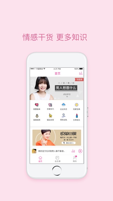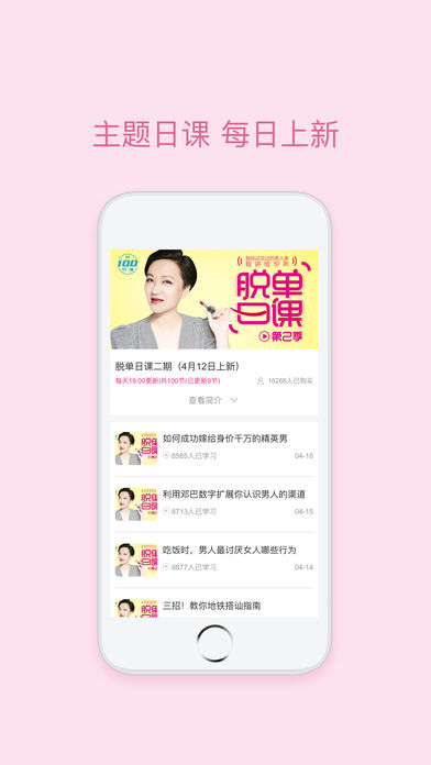中国首个女性励志产品,以女性的爱情、事业和生活方式为出发点,理解女性在社会转型期中遭遇的情感和道德尴尬,为都市白领提供分享和帮助,成为都市白领女性的闺蜜,真正教你主宰自己的人生,在这里,有100种方式,让男人变得听话,让女人变成女王