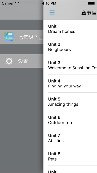 *全套原版录音和教材完全同步,助您成为英语大明星。 *根据课本配套,此应用为译林版初中牛津英语七年级下册完全最新版。 *涵盖全部内容,包括全部课程对话和常用句子、单词列表、复习章节等。 *操作简便、携带方便,永远告别磁带和光盘。 【新梦想】教育应用系列完全同步教材制作,内容完全一致,您可以使用它来进行课文学习,播放教材配套音频,发音纯正地道,寓教于乐,让学习更高效和有趣。 该应用界面简洁操作简单,让孩子在舒适的环境下学习,能点,能读,更能说,是小朋友的好老师、好家长。 功能特色 ■中英文双语对照,同步语音,准确清晰。 ■内容与录音质量放心,地道纯正、原汁源味。 ■语音播放灵活,即点即学,跟读模仿随时随地。 ■完全同步教材制作,内容完全一致。 ■后台播放人性化,锁屏状态可随身听读。 ■界面简单大方,意图明了,功能实用,操作方便。 用我们的责任心、爱心、细心地去点燃学生们的梦想,让有梦想的孩子们慢慢的变化!学习成绩逐步提高,慢慢的,他们又有了新梦想,如此反复...... 让中学生中英文双语对照,发音准确清晰,是小朋友自学的好老师,把家长从繁琐的辅导解答中解放出来! 【新梦想】教育应用系列,快乐中学习,轻松点一点,英语真容易! —【新梦想】教育应用系列— 适用于多种教学场景,您可以更加便捷地进行碎片化学习,期待您的使用! 致力于为中国K12教育提供最优秀的互联网教育软件! 新梦想乐园,伴随青少年健康快乐的成长! *****软件功能***** 1.通用应用,同时支持iPhone,iPod touch,iPad设备 2.可以自动顺序播放功能 3.可以自动记录播放位置,不用担心下次找不到听到哪 4.支持离线播放,即使不联网也一样听,到哪都不怕 5.支持手动拖拽前进、后退播放 6.在兼顾软件容量以及更多课程的情况下,我们最大限度保证音频的高质量,每个有声读物片段都是经过我们精选和亲测 7.最最重要的功能,可以拖动字幕定位,音频随之定位 本应用与《义务教育教科书译林版新课标初中牛津英语七年级下册》课本同步 新版目录: Unit 1 Dream homes Unit 2 Neighbours Unit 3 Welcome to Sunshine Town! Unit 4 Finding your way Unit 5 Amazing things Unit 6 Outdoor fun Unit 7 Abilities Unit 8 Pets 单词表