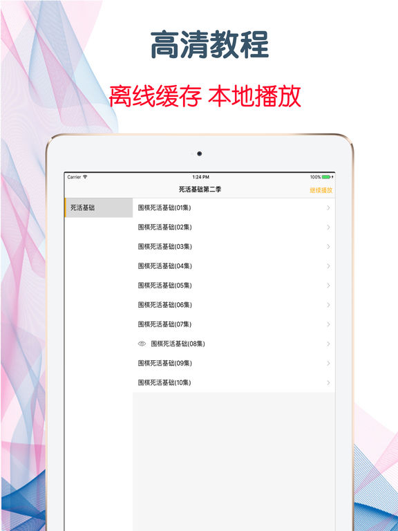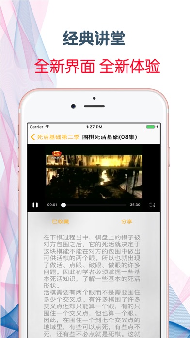 在下棋过程当中,棋盘上的棋子被对方包围之后,它的死活就决定于这块棋能不能在对方的包围中做出可供活棋的两个眼。所以也就出现了做活、点眼、破眼、做眼的许多问题。因此初学者必须掌握一些基本死活知识,了解一些基本的死活形状。 活棋需要有两个眼而不是需要围住多少个交叉点。有许多棋围了许多交叉点但却只能算一个眼,有的只围住一个交叉点,但也算一个眼。因此,在围住一个到七个交叉点的地域里,有些可以点死,有些点不死,还有些不必点就是死棋。这就要看棋子围住交叉点所构成的条件了。 本应用独家载入方天丰老师讲述的《围棋死活基础》37集全高清离线教程,教程共分为4季。 软件功能: 1.性能流畅,同时支持iPhone7,iPod touch和iPad设备 2.高清视频,让您在流畅使用应用的同时学习到必要的知识 3.可以收藏您所喜爱的课程,这洋即使在旅途中也可以随时拿出来回味欣赏 4.支持离线播放,即使没有蜂蜗数据的情况下也可以看您喜欢的课程 5.支持手势快进、后退、调高亮度与声音,这一切都丝滑顺畅 6.支持多任务功能,让您可以在学习喜爱的课程同时与亲人朋友不间断亲密的钩通