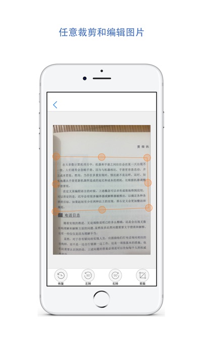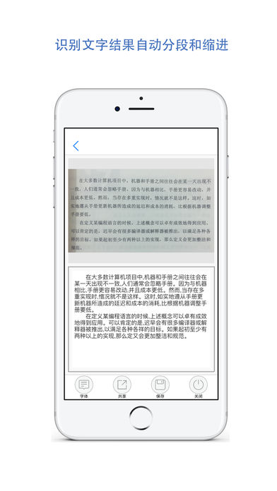 新鲜出炉的文档扫描和OCR类app,可以扫描图像并且识别出可编辑的文字(text格式);图像可以通过拍照或者从相册获取;文字识别结果可以通过airdrop,iCloud,DropBox等方式共享。实乃居家旅行,图文转换,读书批注之必备神器。这个OCR应用相比其他同类OCR产品主要有三个特征: 1 不需要联网,可以离线识别图像 2 不强制注册/登录 3 对不同光照/模糊/轻微扭曲/轻微倾斜条件下的版面分析尽量做到了健壮可靠 如果还有点其他什么的话,那就是目前已经支持简体中文,英语,法语,德语,意大利语,西班牙语这六种语言;后续还会添加对其他语言的支持。 =================3.0.0更新================== 新增加扫描功能,可以把照片转换为PDF文件格式的扫描件(类似扫描全能王/扫描宝/office lens/涂书笔记);使手机成为一台小型全能扫描打印仪器 1 可以拍照或从相册导入图片 并可以剪裁图片 同OCR识别流程 2 可以把图片转换为多种形态(彩照 文档 灰度图)的扫描件;从而实现了去阴影,去杂质等特效 3 可以把图片转换为PDF格式;以便于云共享/传真/打印等 4 可以在转换PDF的过程中往扫描件添加批注 5 生成的PDF文件扫描件可以保存到本地以供查看和共享 =================4.0.0更新================== 实现了多格式转换,可以把识别结果以不同格式保存和共享。 包括txt格式,pdf格式和docx格式(即最新的word格式)。保存的文件可以在本地导出和预览。 ========================================== 本产品还在持续改进中,至少接下来的时间会不断发布新版本。欢迎您反馈任何宝贵的意见和建议。邮箱地址是legendbrother2016@163.com 只是做了一点微小的工作,谢谢大家 =.=